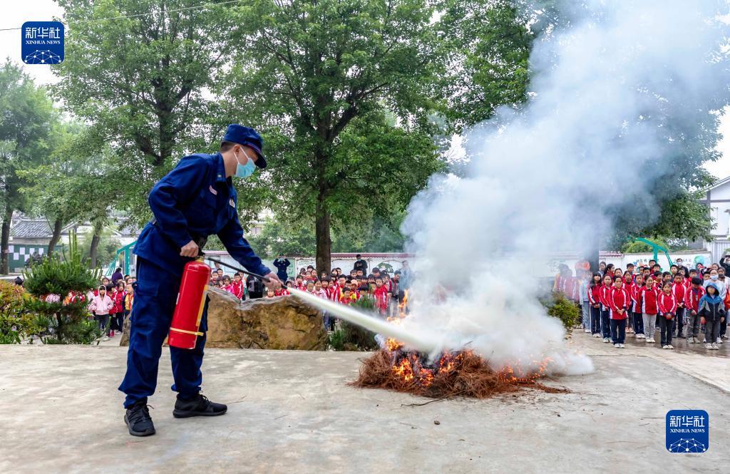 5月11日,消防员在贵州省黔西市林泉镇西溪小学示范灭火器使用方法。