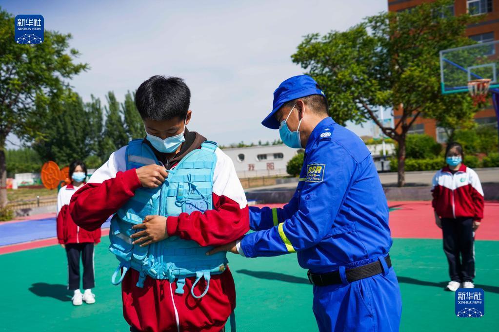 5月11日,河北省遵化市崔家庄镇中学的学生在学习救生衣穿法。
