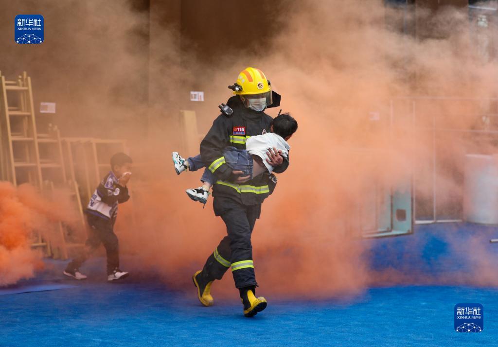 5月11日,消防员在贵州省铜仁市玉屏侗族自治县皂角坪幼儿园引导小朋友进行火灾逃生演练。