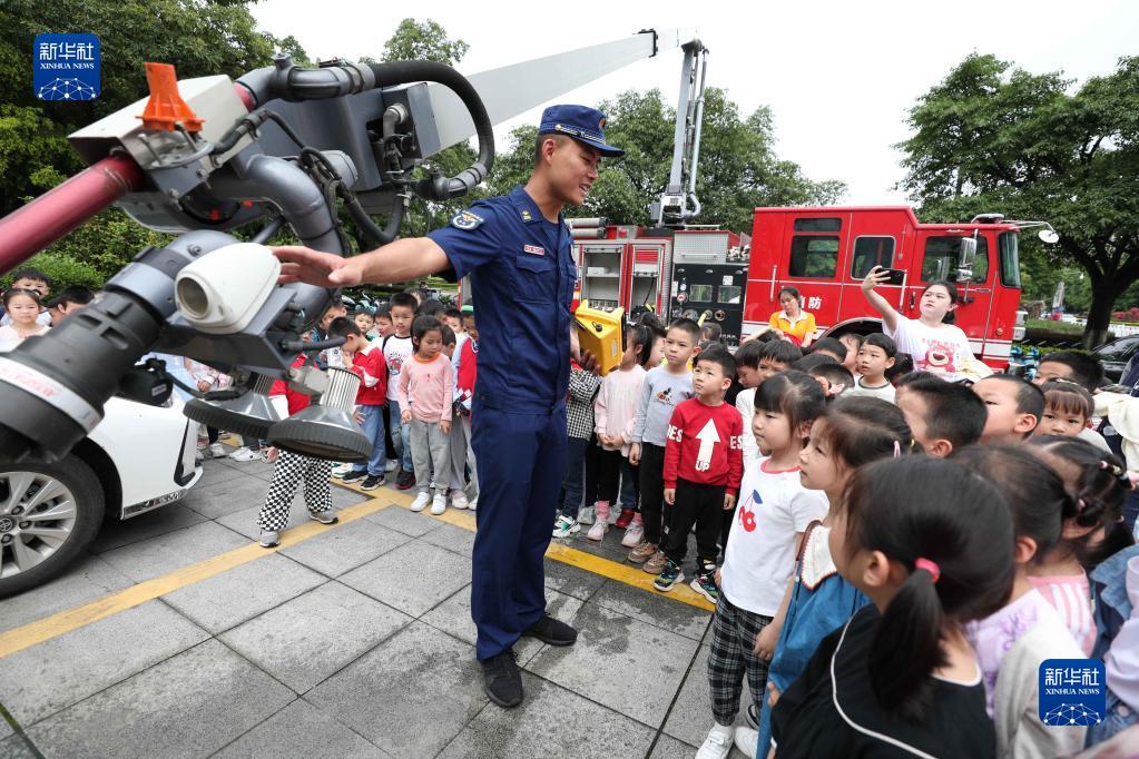 5月11日,在福建省龙岩市一家幼儿园,消防救援人员给小朋友展示消防器材。