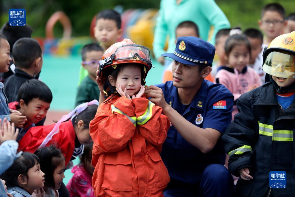 5月11日,在湖南省资兴市鲤鱼江幼儿园,消防员指导小朋友们试穿抢险救援服。