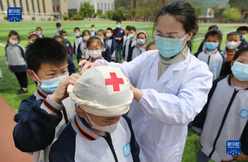 5月11日,江苏连云港市海州湾小学老师在指导小学生如何包扎头部。