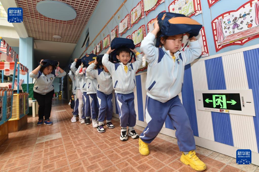 5月11日,在江苏南京建邺区一幼儿园,小朋友在老师的引导下进行应急疏散演练。