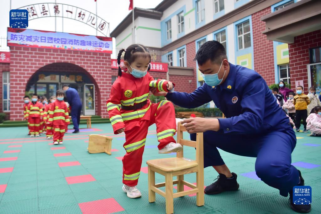 5月11日,在河北省石家庄市井陉县第一幼儿园,小朋友参加趣味消防救援障碍接力活动。