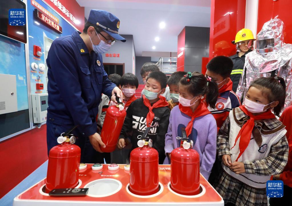 5月11日,在河北省石家庄市行唐县消防救援大队科普教育馆,消防队员在指导学生们使用灭火器。