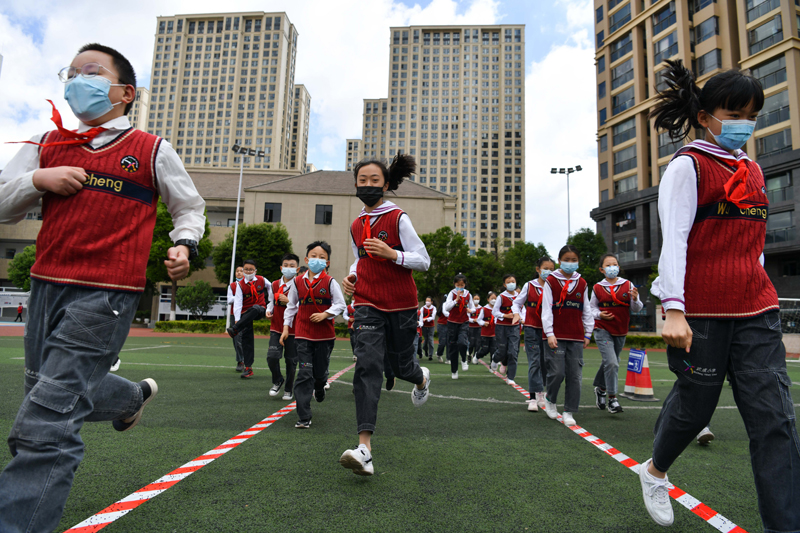 5月11日,学生撤离模拟灾害危险区。当日,在第14个全国防灾减灾日来临之际,云南省自然资源厅的地质专家走进昆明市武成小学国福校区,向学生们进行地质灾害知识科普讲座,并组织应急演练,旨在提升孩子们临灾应急意识。(图片来源:中新社)