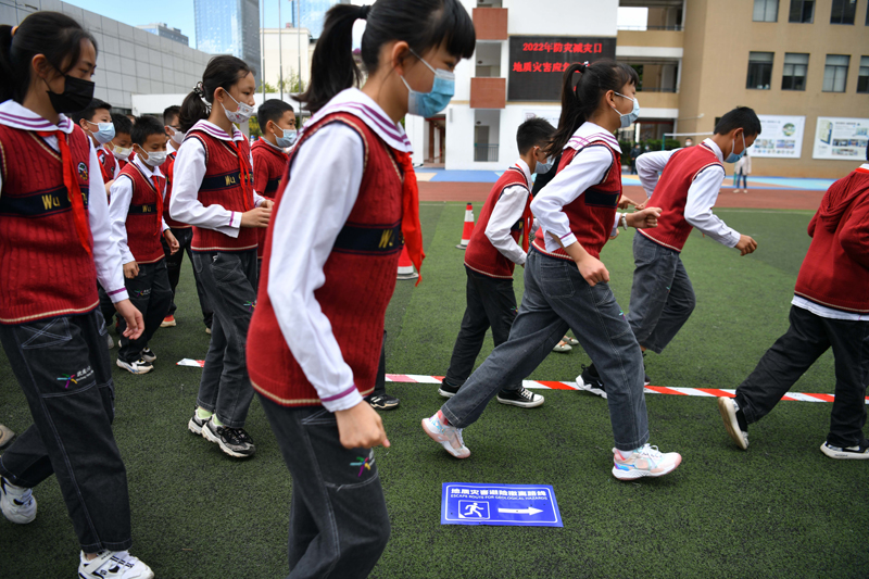 5月11日,昆明市武成小学国福校区的学生撤离模拟灾害危险区。(图片来源:中新社)