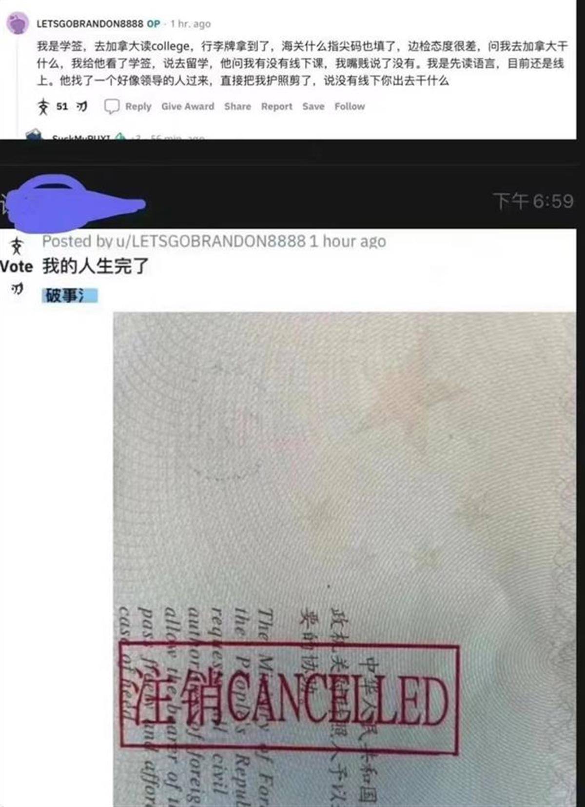 综合中新社、人民网、湖北日报“极目新闻”报道,根据近日网传信息截图,ID为LETSGOBRANDON8888的当事人自述:“我是学签,去加拿大读college,行李牌拿到了,海关什么指尖码也填了。边检态度很差,问我去加拿大干什么,我给他看了学签,说去留学,他问我有没有线下课,我嘴贱说了没有。我是先读语言,目前还是线上。他找了一个好像领导的人过来,直接把我的护照剪了,说没线下你出去干什么?”
