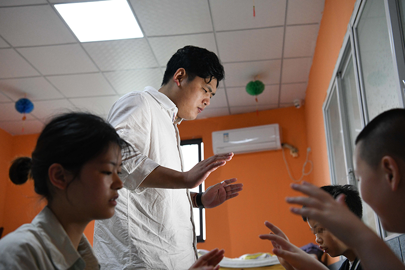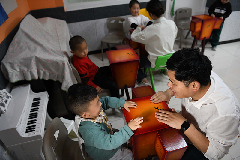 5月13日,在合肥市蜀山区春语儿童康复中心,岳雷(前右)在给孤独症孩子上音乐课。(图片来源:新华社)