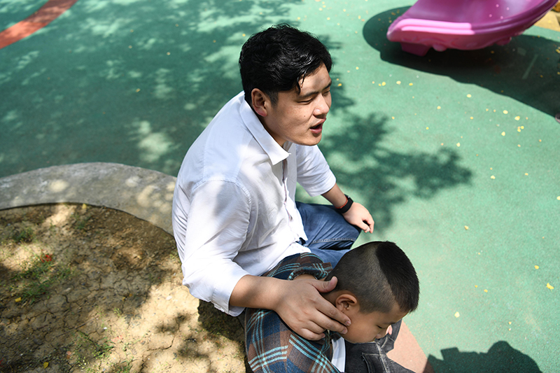 5月13日,在合肥市蜀山区春语儿童康复中心,岳雷和孤独症孩子一起唱歌。(图片来源:新华社)