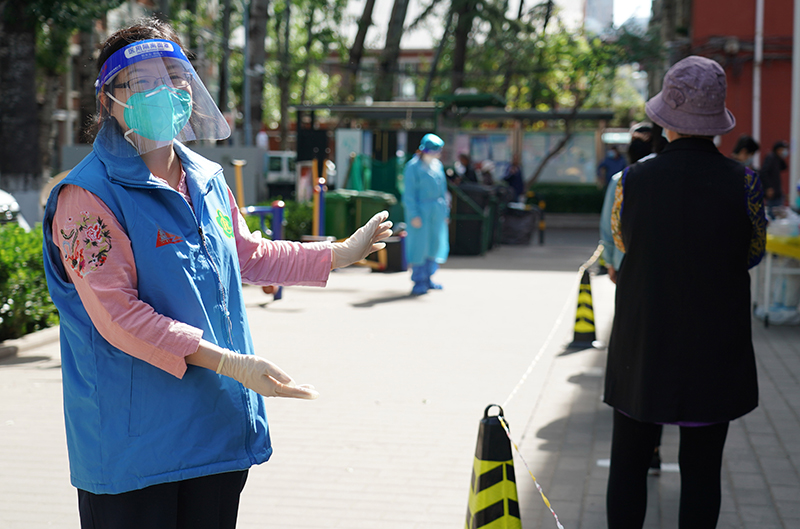 在北京市海淀区八里庄街道首师大社区临时核酸检测采样点,马尔东(左一)引导社区居民进行核酸检测采样(5月7日摄)。(图片来源:新华社)