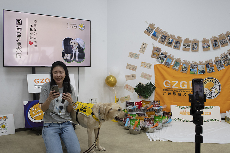 4月27日,广东广州,李苑甄在国际导盲犬日通过直播,介绍广州导盲犬学校近况。(图片来源:中新社)