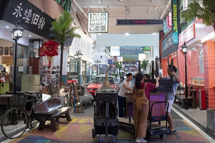 2015年从华南理工大学法学院毕业的武楷斯,没有选择“朝九晚五”的上班族生活。被旧物深深吸引的他,开始以收旧物为生,至今收集了上万件物品,大部分存放在广州番禺区岭南电商园一间店铺里,取名“永续旧物”。图为武楷斯(右)在“永续旧物”店门口打包准备出租的旧物。(图片来源:中新社)