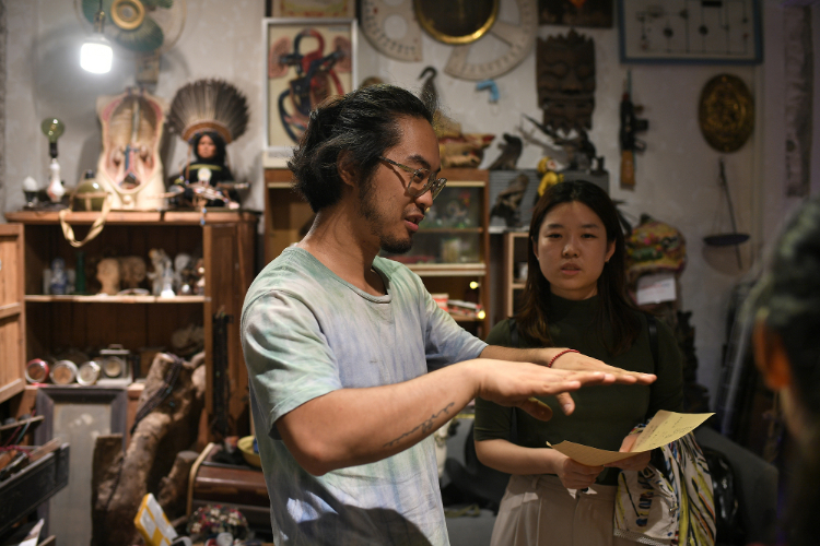 当夜幕降临,广州文昌北路的古玩旧货市场开始热闹起来,这里是广州著名的“天光墟”(民间集市),每天入夜后开始营业,天亮时结束。摊主们在地上铺一块方布,摆上旧家具、老式收音机、民清碗碟、古董、字画等,待有缘人买下,“95后”小伙武楷斯是少数经常光顾这里的年轻人。图为武楷斯在“永续旧物”店和顾客讨论出租旧物的方案。(图片来源:中新社)