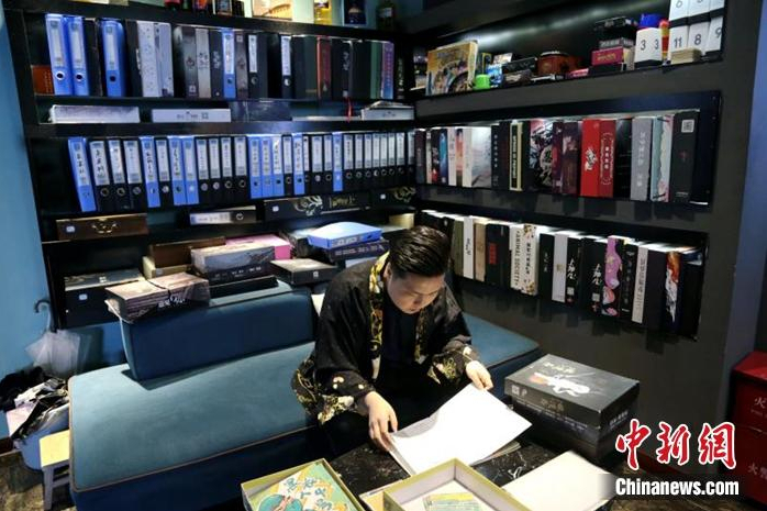 为了体验不同的“人生剧本”,辞掉国企工作,投身热爱的“剧本杀”行业当中的刘明浩,经过几年打拼,他已在西安开设两家“剧本杀”线下门店。虽然每天要打理店铺运营,但只要有时间,刘明浩还是会客串“剧本杀”的主持人,带着玩家在不同剧本中“穿越”。图为“剧本杀”从业者刘明浩在研究“剧本”。(图片来源:中新网)