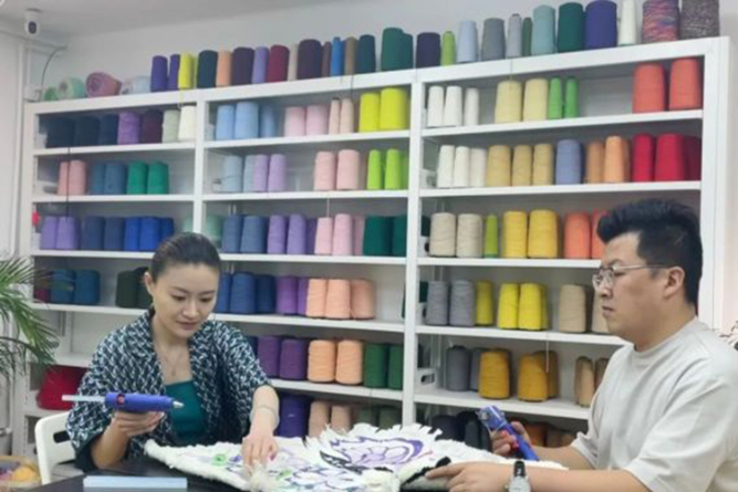 “90后”青年刘颖颐今年在北京798艺术园区开办了她的新一家簇绒店。“簇绒”是一种编织工艺,仅靠一块板、一块布、几坨毛线和一把簇绒枪,就能制作出毛茸茸的地毯、抱枕、背包等。刘颖颐说,顾客在手工DIY中体会到沉浸式乐趣,自己在教授技艺过程中也能获得收入。图为刘颖颐(左)与合伙人一起制作地毯。(图片来源:新华社)