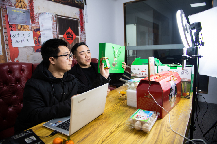25岁的蒋连超,2019年从湖南城市学院测绘工程专业毕业,放弃了进入大型国企的机会,成为湖南省沅江市胭脂湖街道南竹山村的“乡村合伙人”。凭借自己在校期间积累的丰富创业经验,他带领村民办农庄、搞养殖,还组建团队实现了当地农产品销售的网络化运营。图为蒋连超(右)在湖南益阳市沅江高新技术产业园区与搭档一起直播带货。(图片来源:新华社)