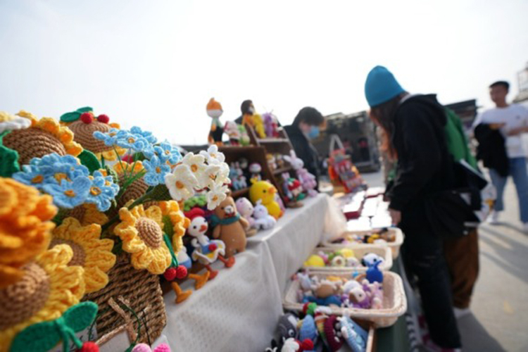 在古都西安的黑凤梨集市,原创饰品、DIY服装、手工美食琳琅满目,成为“Z世代”眼中的“打卡圣地”,在这里不仅能够淘到新鲜独特的“好玩意”,更能结交有着相似爱好的伙伴。23岁的马亦聪是一名簇绒毯爱好者,第一次在集市摆摊,卖自己DIY的簇绒毯,大概赚了1000元。在和其他摊主、顾客聊天的过程中,马亦聪慢慢认识了很多朋友。在她看来,集市不再只是一个简单的交易场所,而是年轻人展示自我个性、交流生活方式的舞台。图为顾客在西安市老菜场黑凤梨集市上选购手工商品。(图片来源:新华社)