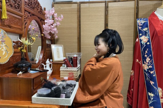 绫罗绸缎,翠玉珍珠,古风桌椅,摆设成小而美的汉服店。山东济南市大明湖畔,这家“Z世代”经营的汉服店受到欢迎。舒秋红是这家汉服店的老板,她是贵州来的苗族姑娘,自小对传统民族服饰感兴趣。“我和好多顾客都成了朋友,大家有相同的爱好,我们还经常交流汉服簪花的款式、制作技艺。”舒秋红说,从事汉服行业后,发现“同道中人”不在少数,热爱传统文化的年轻人正推动“美丽事业”不断发展。图为舒秋红在自己的汉服店里梳妆。(图片来源:新华社)