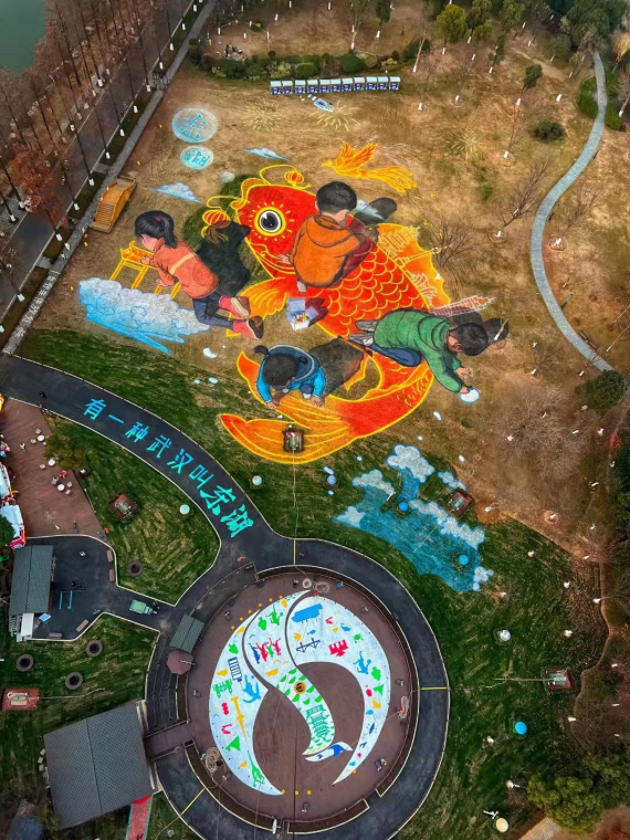 五月初夏,在武汉市东湖风景区的草地上,一幅巨大的3D画栩栩如生。“在6000平方米的草地画锦鲤、黄鹤楼,这让我觉得很酷。”今年刚毕业于视觉传达专业的“95后”女生胡美婷被画作吸引,决定加入幕后创作团队——超级画咖。这个年轻的团队在武汉创作了近千幅独具特色的公共空间艺术画,被不少人看到后搬上抖音等社交平台,收获了数百万浏览量。图为超级画咖团队创作的3D草地画。(图片来源:新华社)