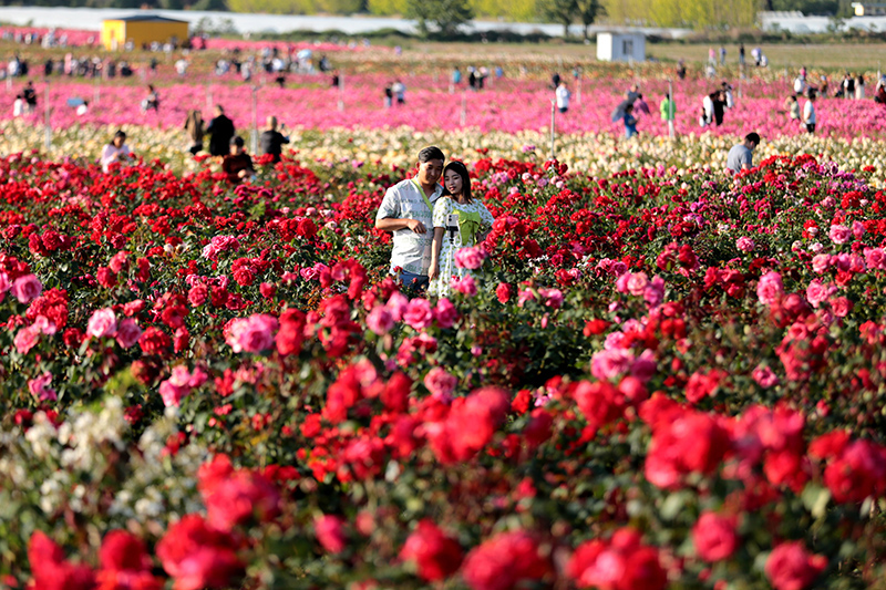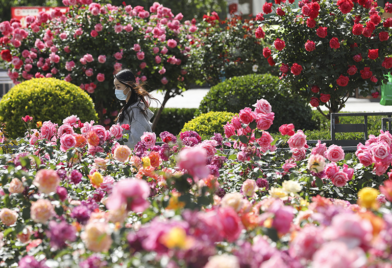 5月15日,陕西西安,市民在花间游玩。近日,在位于西咸新区空港新城的云间花海内,百万株月季花开正艳,吸引民众前来赏花、游玩。