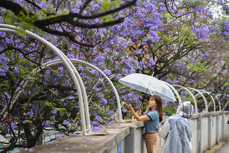 5月15日,云南昆明,市民在细雨中撑伞漫步于蓝花楹树下,感受雨中赏花的别样滋味。
