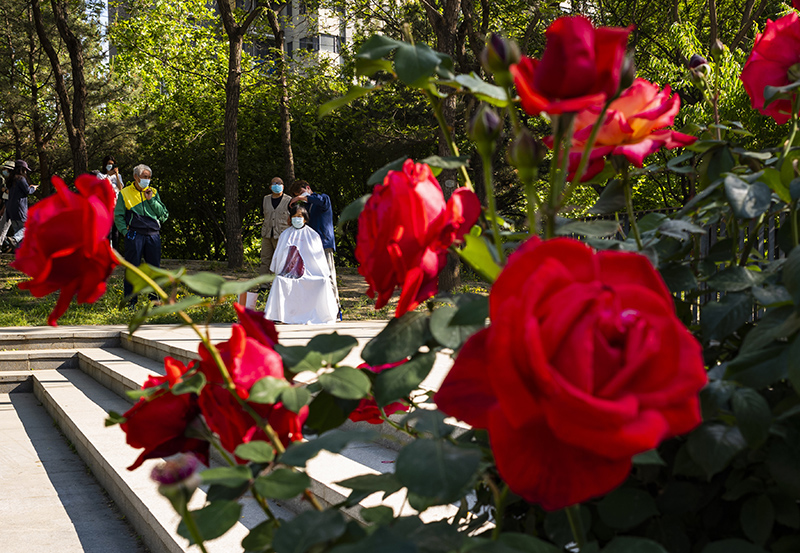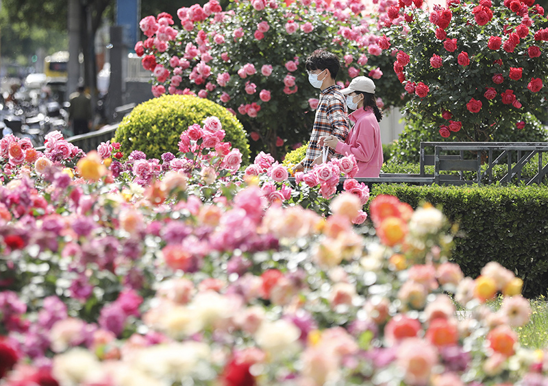 5月14日,市民走过月季花开的北京街头。初夏时节,北京大街小巷、环路的月季花竞相开放,扮靓京城。
