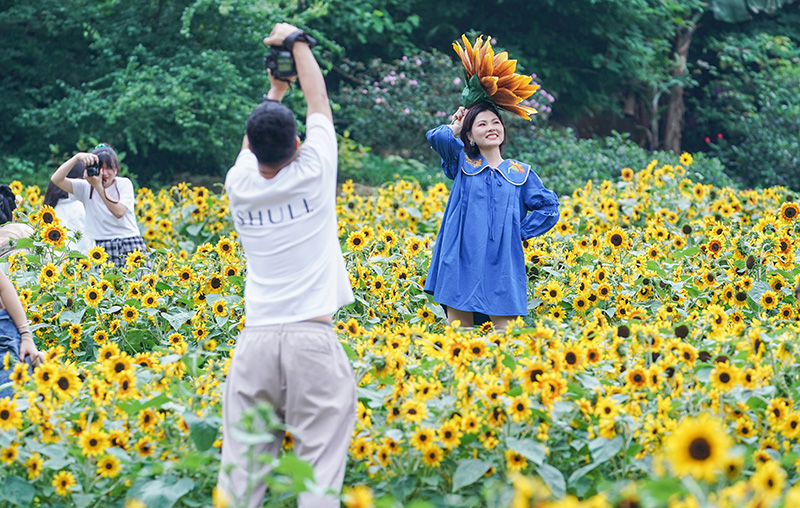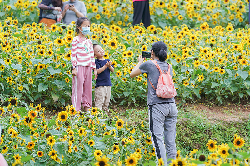 5月14日,广西南宁青秀山风景区,大片盛开的葵花吸引市民前来游玩。