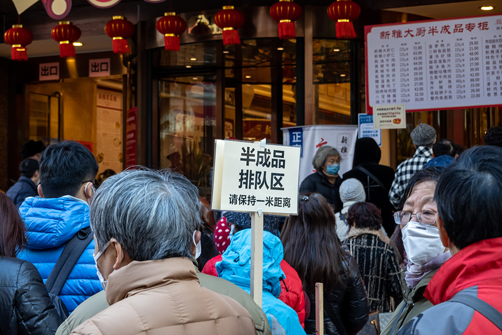 上海南京路步行街,市民排队购买老字号半成品菜。(图片来源:中新社)