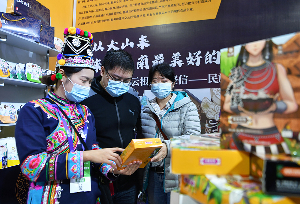在2021中国预制菜产业大会暨展会现场,来自云南的参展商在介绍云南特色菜肴快熟过桥米线。(图片来源:新华社)