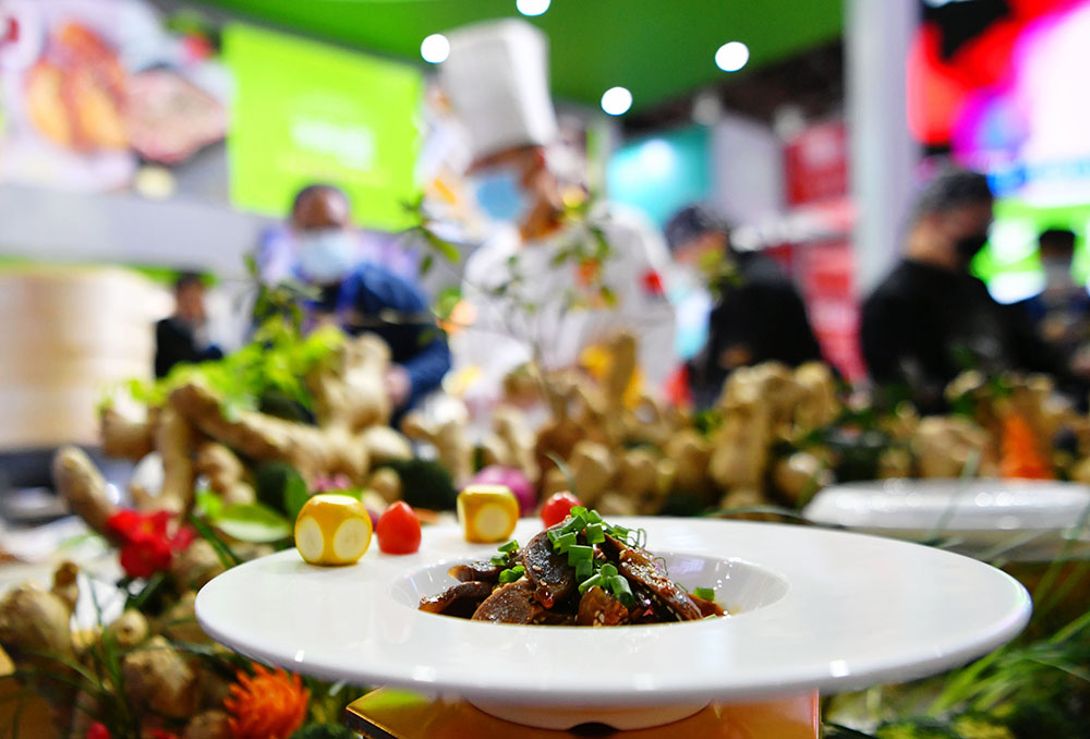 2021中国预制菜产业大会上,参展商展示一盘快熟菜品。(图片来源:新华社)