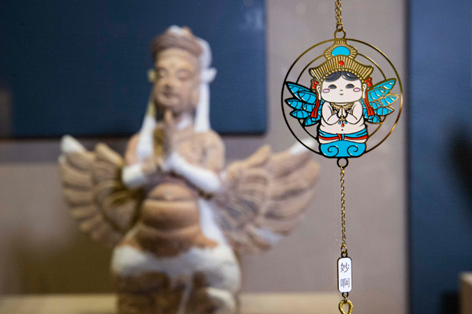 宁夏博物馆的文创产品“妙娃”车载挂件(前)与馆藏红陶迦陵频伽。“妙娃”形象,融合了“妙音鸟”的形象故事和敦煌壁画,并结合宁夏当地方言取名“妙娃”。它的文物原型为“迦陵频伽”。