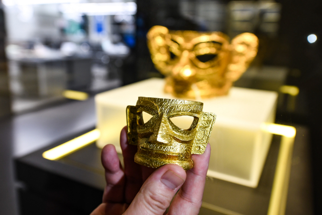 近年,三星堆遗址重要考古发现成果陆续公布,带动三星堆博物馆的文创产品设计销售热潮,一些文创产品取材于发掘出土的金面罩、青铜器等文物,受到人们的欢迎。图为在三星堆博物馆拍摄的金面罩文创冰箱贴。