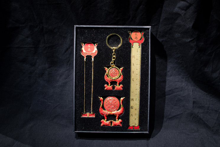 在湖北省博物馆,许多文创产品取材于彩绘漆木虎座鸟架鼓、铜鹿角立鹤、彩绘漆木猪形盒、彩漆木雕鸳鸯形盒、彩绘漆木卧鹿等以动物为主题元素的文物,深受人们欢迎。图为取材于彩绘漆木虎座鸟架鼓的尺子、钥匙扣等文创产品。