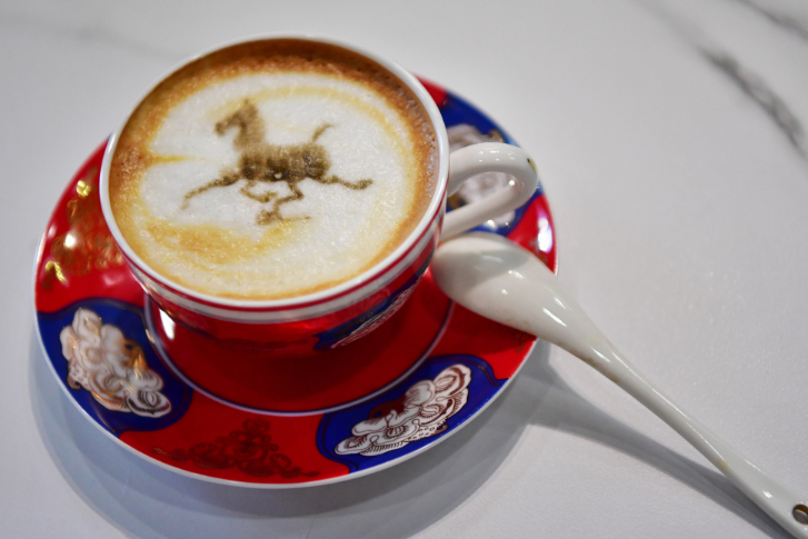 甘肃省博物馆的“镇馆之宝”——铜奔马,又称“马踏飞燕”,通高34.5厘米,长45厘米,20世纪60年代出土于甘肃省武威市雷台汉墓,1983年被确定为中国旅游标志。图为在甘肃省博物馆拍摄的铜奔马咖啡。