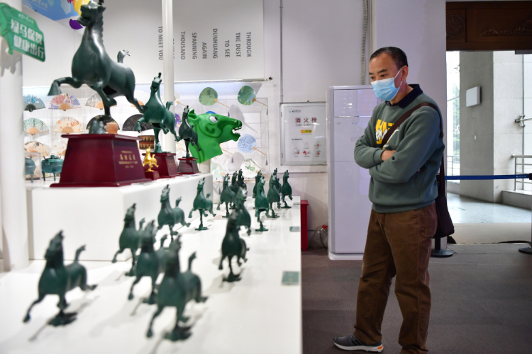 铜奔马造型奇特,矫健优美,如在空中飞驰,一足超掠飞鸟,表现了中国古代艺术匠师丰富的想象力和高超的铸造工艺。近年来,甘肃省博物馆推出以铜奔马为主题的系列文创产品,让文物走进生活,受到人们喜爱。图为参观者在甘肃省博物馆文创商店欣赏铜奔马工艺摆件。
