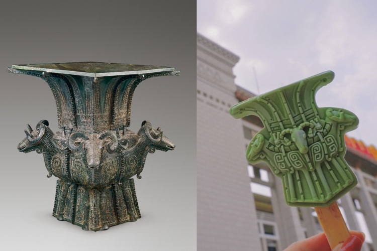 中国国家博物馆以藏品及展览为主题,开发饮食文创,借食品传递传统文化背后的美好寓意,讲述文物蕴藏的历史故事,让国博文物走进大众生活。左图为商代青铜器四羊方尊,右图为抹茶四羊方尊雪糕。