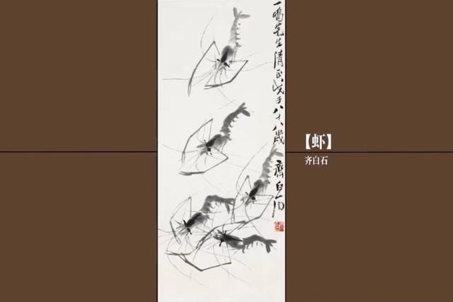 中国电视报道,中国北京跨车胡同的院子,几十年前曾门庭若市,人们口耳相传,胡同里住着一位叫齐白石的画家。他画的虾比活虾还像真的,仿佛在透明的水中游动。齐白石画虾有自己的方法——淡墨勾染虾身,浓墨描绘虾头,让虾体轻盈透明,虾头坚实挺拔。每一节虾背拱起的弧度,每一根虾须的弯折变化中甚至能看出水的阻力和虾的跃动。它们不是被观赏的对象,它们正主宰着自己的生命。