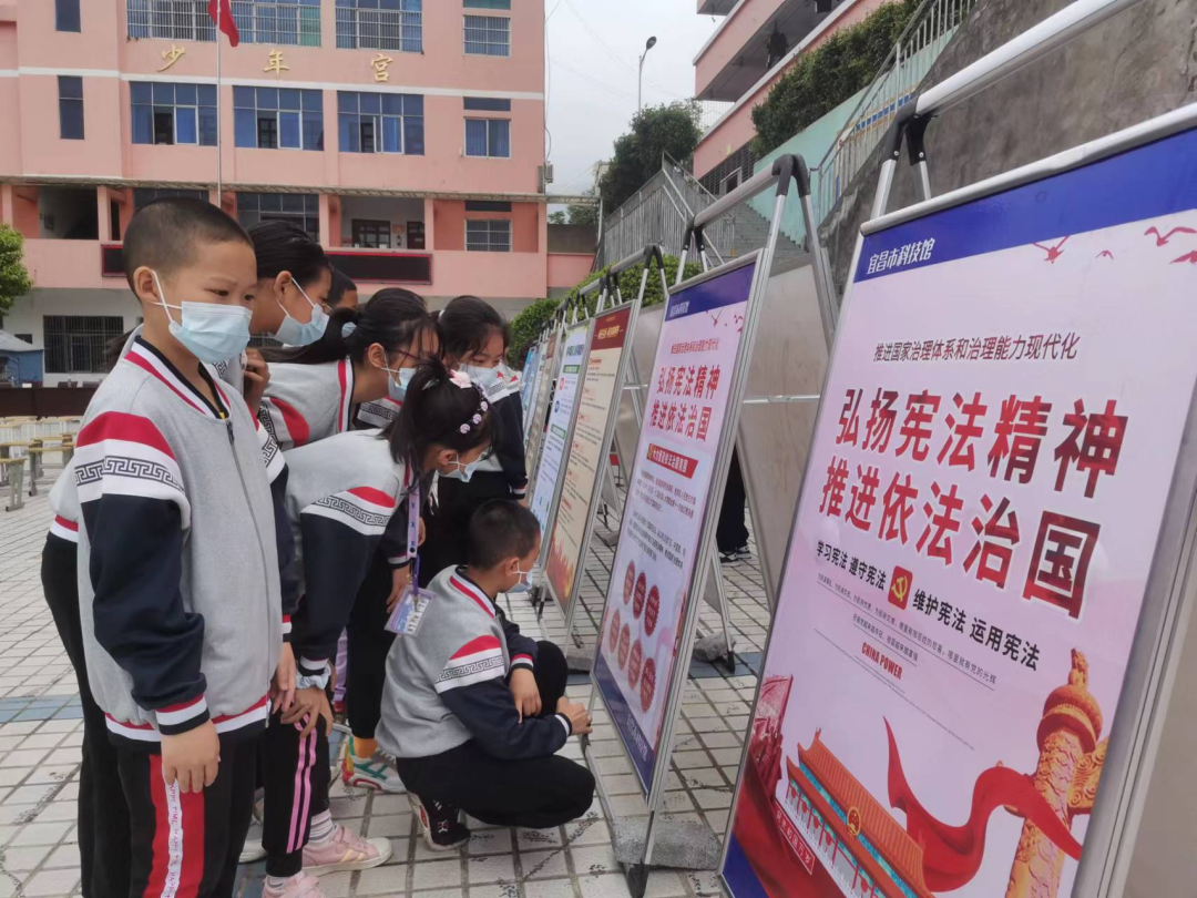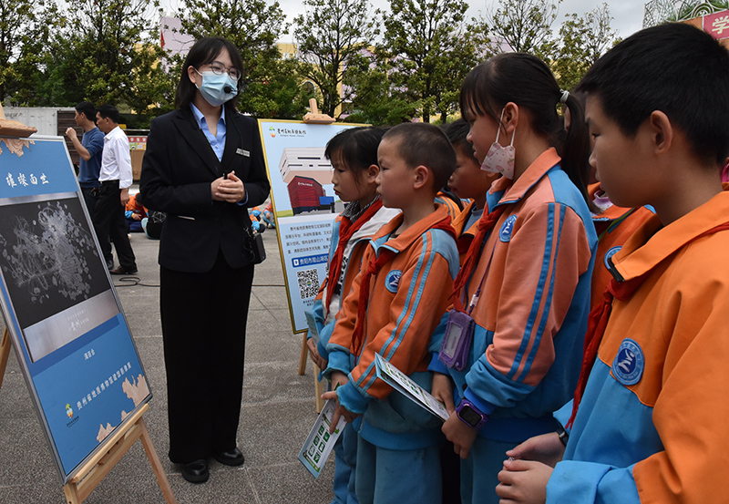5月24日,在贵州省惠水县惠民小学,贵州省地质博物馆工作人员给小学生讲解博物馆带来的展板。近日,贵州省启动主题为“走进科技你我同行”的科技活动周。(图片来源:新华社)