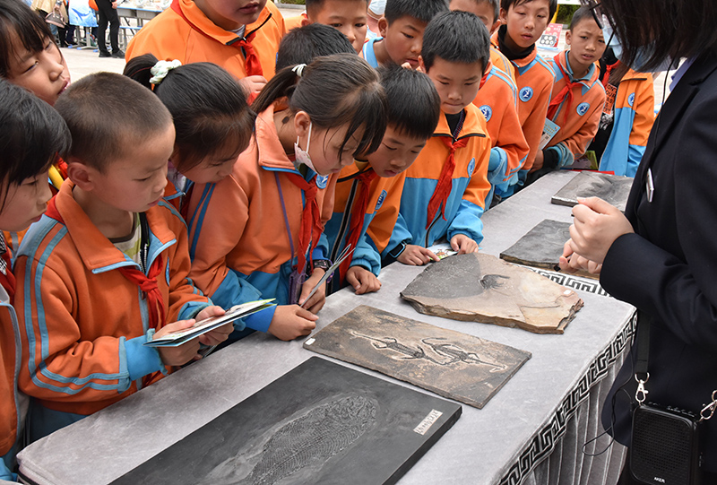 5月24日,贵州省惠水县惠民小学学生观看贵州省地质博物馆带来的化石实物。(图片来源:新华社)