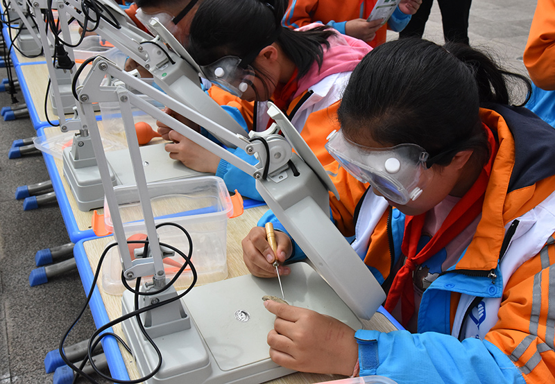 5月24日,在贵州省惠水县惠民小学,学生在贵州省地质博物馆工作人员指导下进行古生物化石修复体验活动。(图片来源:新华社)