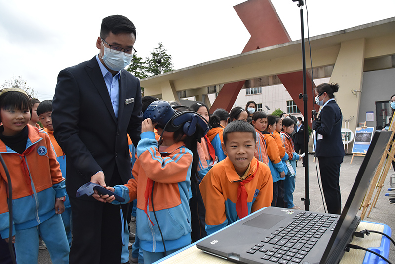5月24日,在贵州省惠水县惠民小学,贵州省地质博物馆工作人员带领小学生进行VR科普互动体验。(图片来源:新华社)