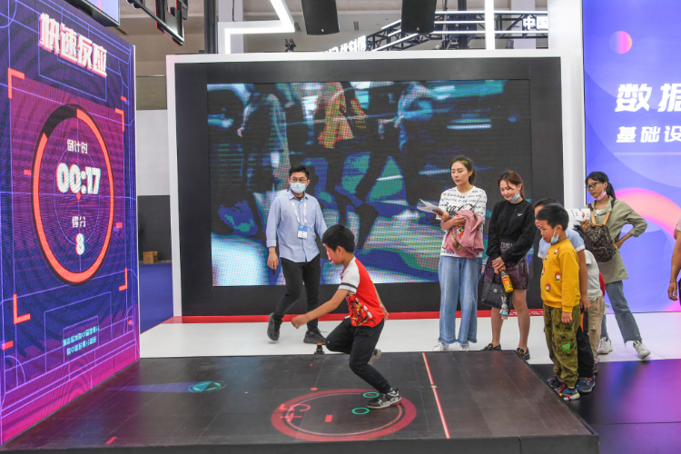 小朋友在博览会上体验一款数据流通大作战游戏。