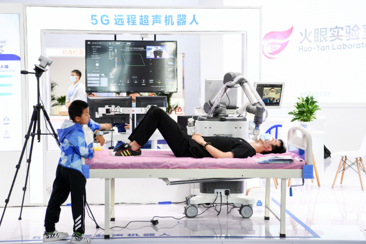 参会者在上一届“数博会”上体验5G远程超声机器人诊疗。