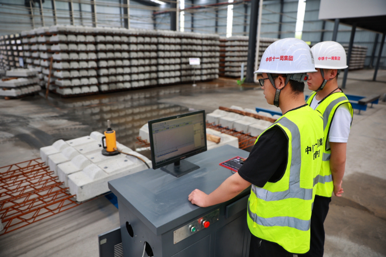 在贵南高铁施工建设中,中铁十一局独山梁枕场承担着贵州段全线61万余根轨枕生产任务。该场配备了一条智能化程度较高的轨枕生产线,该生产线将5G、物联网、大数据和智能机器人等技术融为一体,实现轨枕生产的高效化、信息化、智能化。图为工作人员在轨枕生产线上操作设备。