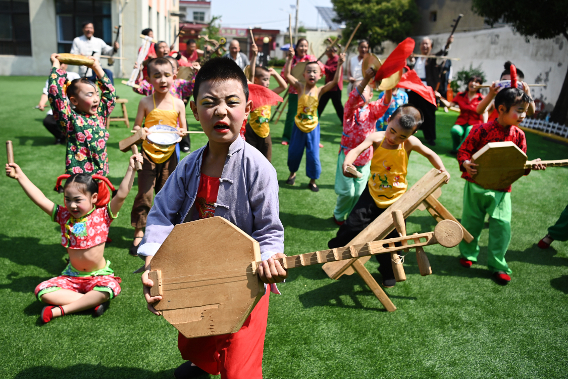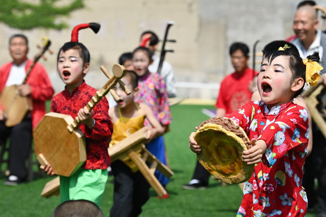 5月26日,潼关黄河老腔幼儿团的孩子们在表演黄河老腔。(图片来源:新华社)