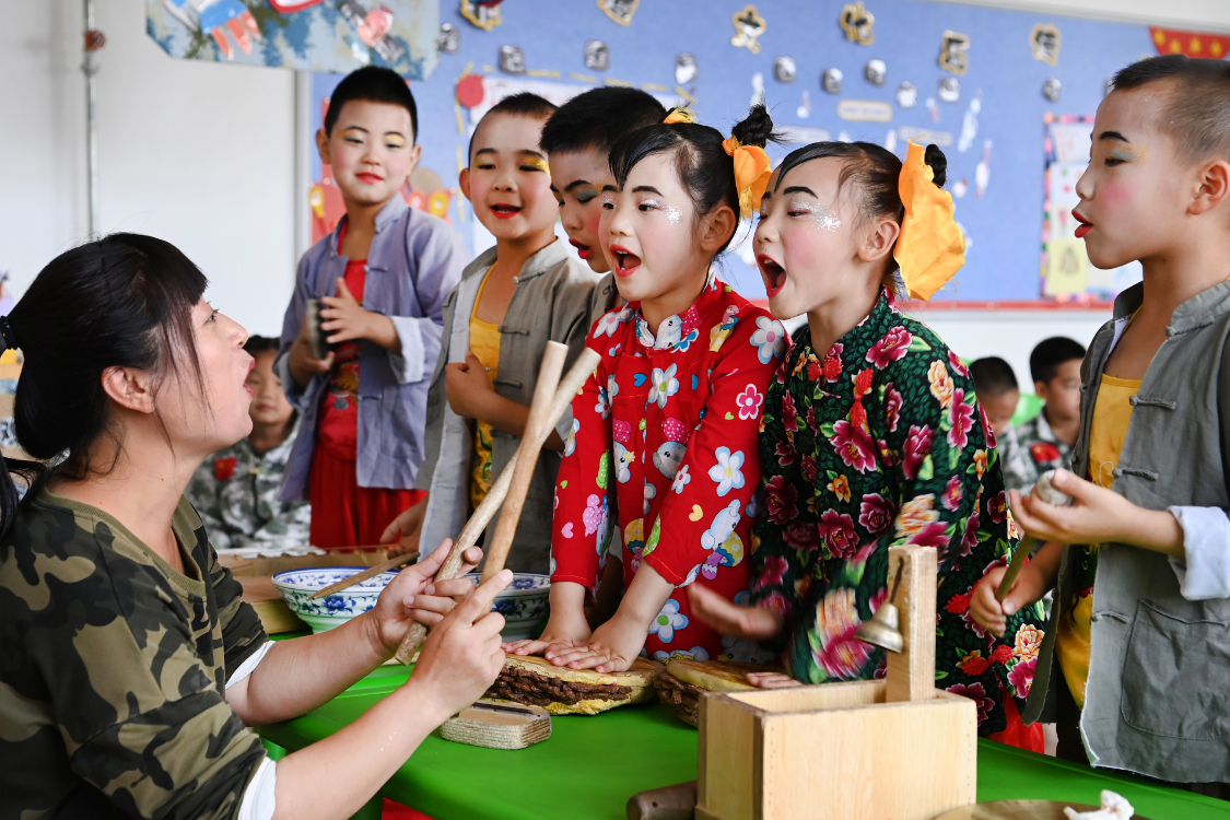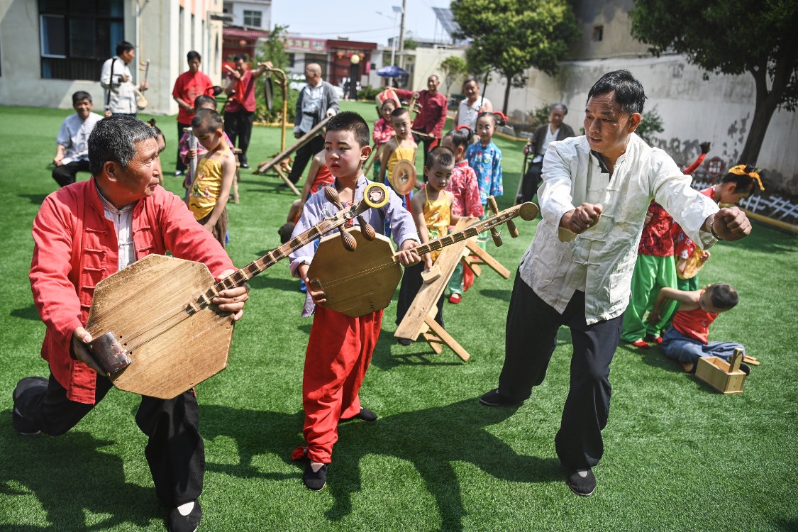 5月26日,黄河老腔艺术团的老艺人在幼儿园为孩子们传授老腔艺术技巧。(图片来源:新华社)
