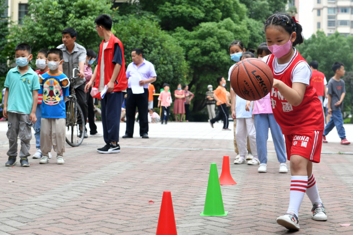 安徽省合肥市常青街道淝南社区5月28日开展“游戏润童年”六一节主题活动,小朋友们快乐互动迎接“六一”儿童节。(图片来源:中新社)