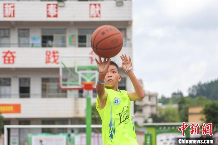在位于赣南老区大山深处的江西赣州寻乌县澄江中心校,2022寻乌县小学生校园篮球精英赛激战正酣。图为一名球员起跳准备投篮。(图片来源:中新网)
