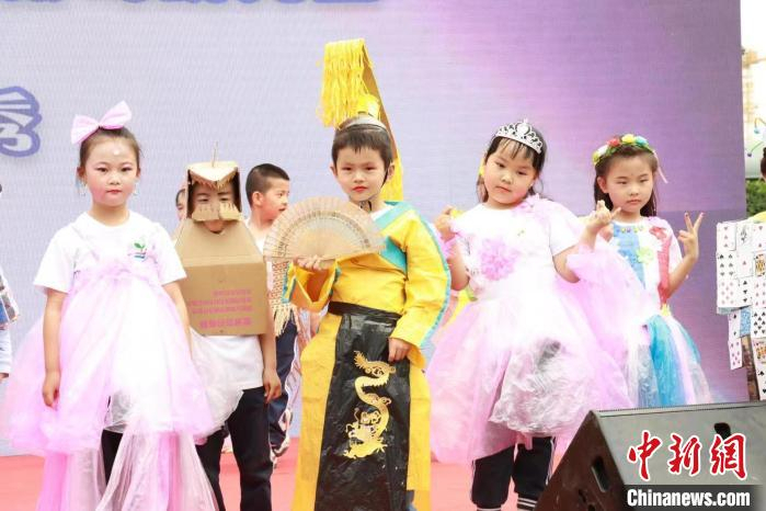 为迎接“六一”国际儿童节,兰州一所幼儿园的儿童在家长和老师们的指导下,制作成创意十足的环保服装。(图片来源:中新网)